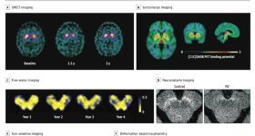 帕金森病PD的臨床過程中使用的診斷和進(jìn)展影像學(xué)生物標(biāo)志物的時(shí)間相關(guān)性。對磁共振成像T1加權(quán)成像/單光子發(fā)...