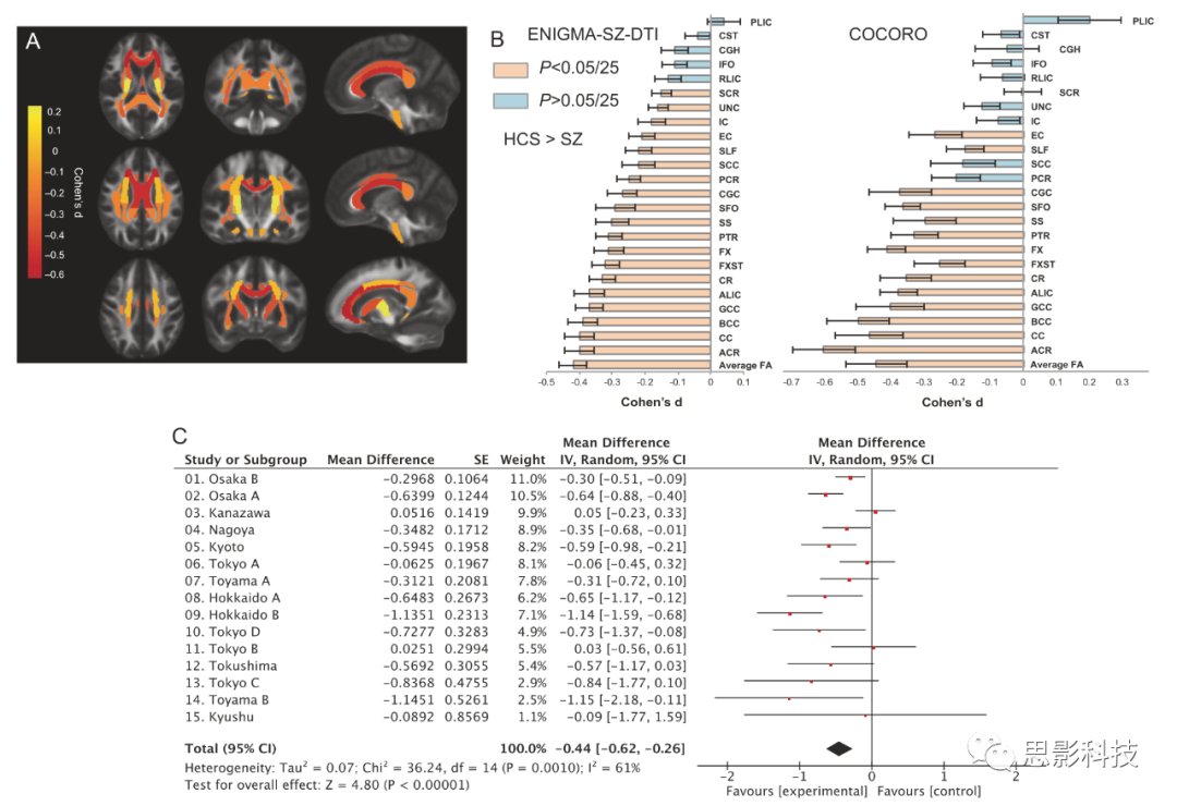 C:15個隊列的精神分裂癥患者與HCS平均FA差異的效應量森林圖。
