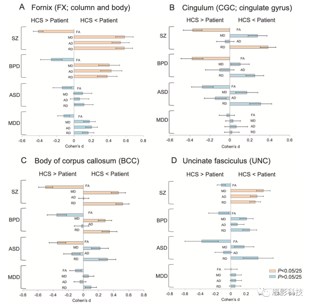 明確精神障礙患者大腦結(jié)構的共性和差異對于理解精神疾病的病理生理學具有重要意義。最近,ENIGMA精神分裂癥DTI工作組進行了大規(guī)模的薈萃分析,并指出精神分裂癥中存在廣泛白質(zhì)微結(jié)構改變;然而,迄今為止還沒有進行過類似的精神障礙間的研究。本研究對健康對照(HCS;N=1506)與精神分裂癥(N=696)、雙相情感障礙(N=211)、自閉癥譜系障礙(N=126)及抑郁障礙(N=398;12個地點總N=2937)之間的白質(zhì)微結(jié)構差異進行了mega分析。