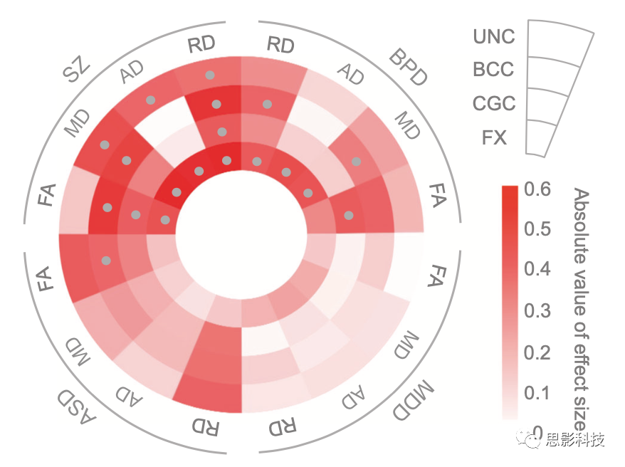 色階表示每個患者群體(精神分裂癥、雙相情感障礙、自閉癥譜系障礙和重度抑郁障礙)和每個感興趣區(qū)域(UNC、BCC、CGC和FX)與健康對照受試者之間DTI指數(shù)(FA、MD、AD和RD)的Cohen d效應量的絕對值。灰點表示統(tǒng)計學顯著性。精神分裂癥、雙相情感障礙、自閉癥譜系障礙患者胼胝體白質(zhì)改變較為常見;精神分裂癥、雙相情感障礙患者穹窿、扣帶回等邊緣系統(tǒng)白質(zhì)改變較為常見;連接新皮質(zhì)區(qū)(如鉤狀束)的白質(zhì)區(qū)的微結(jié)構改變是精神分裂癥患者特有的。