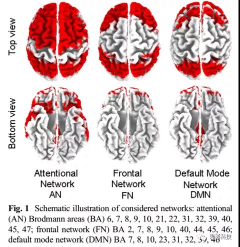 利用eLORETA計算ROI之間的功能連接,ROI的定義參考broadman分區(qū)。左右腦區(qū)共包括42個ROI(BAs 1, 2, 3, 4, 5, 6, 7, 8, 9, 10, 11, 13,17, 18, 19, 20, 21, 22, 23, 24, 25, 27, 28, 29, 30, 31, 32,33, 34, 35, 36, 37, 38, 39, 40, 41, 42, 43, 44, 45, 46, 47)、注意網(wǎng)絡(luò)包括13個ROI(BAs 6, 7,8, 9, 10, 21, 22, 31, 32, 39, 40, 45, 47)、額網(wǎng)絡(luò)包括9個ROI(BAs 2, 7, 8, 9, 10, 40, 44, 45, 46)、默認模式網(wǎng)絡(luò)包括8個ROI(BAs 7, 8, 10, 23, 31,32, 39, 46)。詳見圖1。