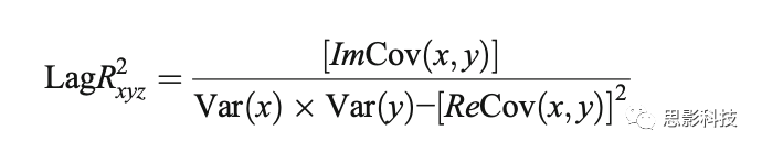 對基于eLORETA計算得到的電流密度時間序列,提取84個ROI最近鄰體素(以每個感興趣的BA中心坐標為原點,19mm為半徑)的信號,計算每個被試不同頻段下[delta (2–4 Hz)、theta (4–8 Hz)、alpha 1 (8–10.5 Hz)、alpha 2 (10.5– 13 Hz)、beta 1 (13–20 Hz)、beta 2 (20–30 Hz) 和gamma (30–45 Hz)]的皮層內(nèi)延遲線性相干(intracortical lagged linear coherence)。公式如下: