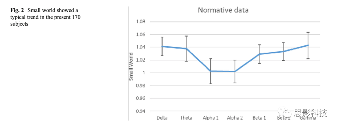 腦網(wǎng)絡(luò)包括有向/無向、二值/加權(quán)幾種。無向網(wǎng)絡(luò)不考慮連接的方向,哪個腦區(qū)影響哪個腦區(qū);有向網(wǎng)絡(luò)考慮連接的方向,A腦區(qū)影響B腦區(qū)還是B腦區(qū)影響A腦區(qū)。二值網(wǎng)絡(luò)將腦區(qū)連接分為2類,有連接的全部標記為1,不考慮連接的強弱,無連接的標記為0;加權(quán)網(wǎng)絡(luò)則考慮連接的強弱。本研究選擇無向加權(quán)網(wǎng)絡(luò)進行分析。節(jié)點由BAs表示,連邊由eLORETA計算得到的延遲線性相干進行表示。作者計算了集聚系數(shù)、最短路徑以及小世界屬性考察網(wǎng)絡(luò)整體效率。