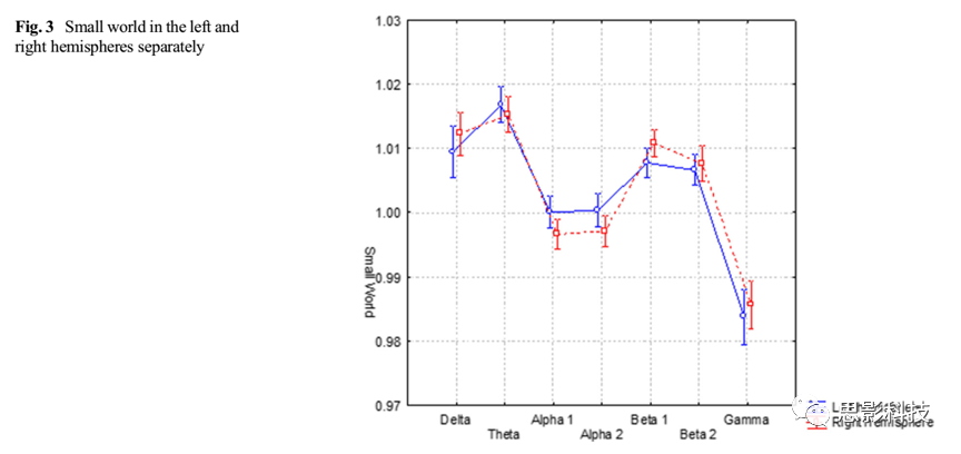 從描述性分析來看,delta、theta和gamma的小世界屬性較大,alpha的小世界屬性較小。從統(tǒng)計結(jié)果來看,整個腦網(wǎng)絡(luò)并不存在左右腦區(qū)差異,但是子網(wǎng)絡(luò)的左右腦區(qū)存在差異。