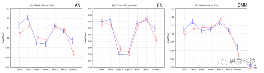 為了分析左右腦區(qū)的差異,進行2(腦區(qū):左 vs. 右)×7(頻段:delta vs.theta vs.alpha1 vs.alpha2 vs.beta1 vs.beta2 vs. gamma)的雙因素方差分析,但是差異均不顯著(詳見圖3)。此外,為了分析3個子網(wǎng)絡(luò)左右腦區(qū)(AN/FN/DMN)的差異,分別對每個腦網(wǎng)絡(luò)進行2(腦區(qū):左 vs. 右)×7(頻段:delta vs. theta vs.alpha1 vs.alpha2 vs.beta1 vs.beta2 vs. gamma)的雙因素方差分析。結(jié)果如下: