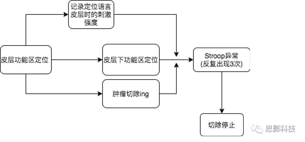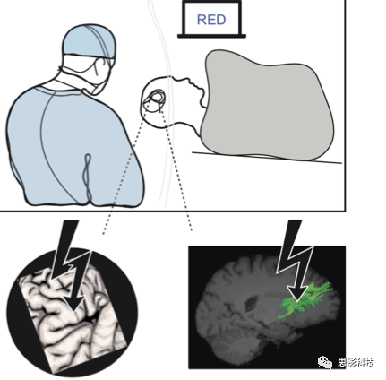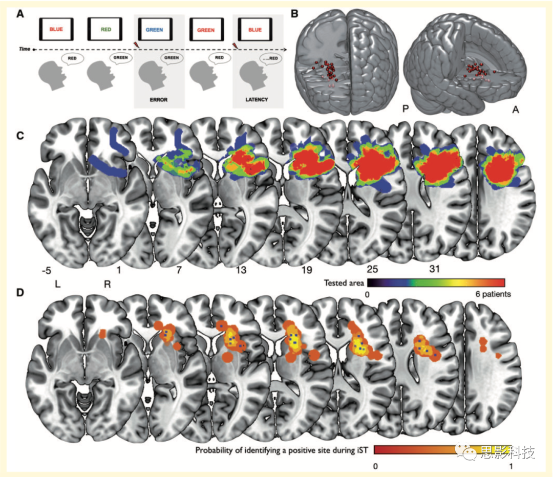 編者注:Stroop試驗,讓患者在2s內(nèi)說出屏幕上“文字的顏色”,如圖,屏幕上顯示的是“紅”這個字,用藍色顏色寫的,所以患者要說藍才是正確的。術(shù)中通過刺激皮層及皮層下纖維束觀察患者回答正確率變化情況。該試驗為經(jīng)典測試“干擾控制”的試驗。
