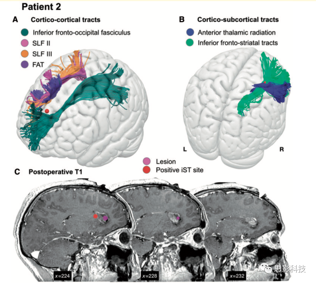 在iST組中,刺激器一般選擇 60 Hz的低頻刺激,使用與定位語言區(qū)時相同的電流強度(2.75+-0.93 mA)。少數(shù)情況下使用高頻刺激(train of 5, pulse duration 0.5ms; interstimulus interval: 3–4ms, repetition rate 3Hz)。手術(shù)過程中,我們首先用相應低頻電刺激作用于皮層下結(jié)構(gòu),并評估其對患者計數(shù)和命名功能的影響。若語言功能未受影響,則開始iST,同時切除腫瘤,直到出現(xiàn)iST錯誤,手術(shù)切除立即停止。 通過將刺激器與超聲探頭相連,以確定導致iST錯誤的具體位置。當患者直接說出單詞代表的顏色,而非字體顏色;或雖然回答正確但回答太慢(延時>1s)時,均將被判定為iST錯誤。當間隔一定時間,刺激同一皮質(zhì)下部位三次,均導致iST出現(xiàn)錯誤時, 則該區(qū)域被認定為導致iST錯誤區(qū)域。術(shù)中刺激全過程錄像,術(shù)后臨床醫(yī)生將對定位全過程統(tǒng)一進行評估。iST錯誤判定由神經(jīng)心理學家進行,判定過程不受神經(jīng)解剖位置影響(判定過程使用盲法,神經(jīng)心理學家不知道刺激位置信息,只根據(jù)患者反應判定)。