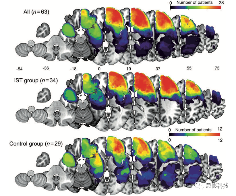 腫瘤位置:最大重疊區(qū)域(n=12)位于右額葉和顳葉前部。