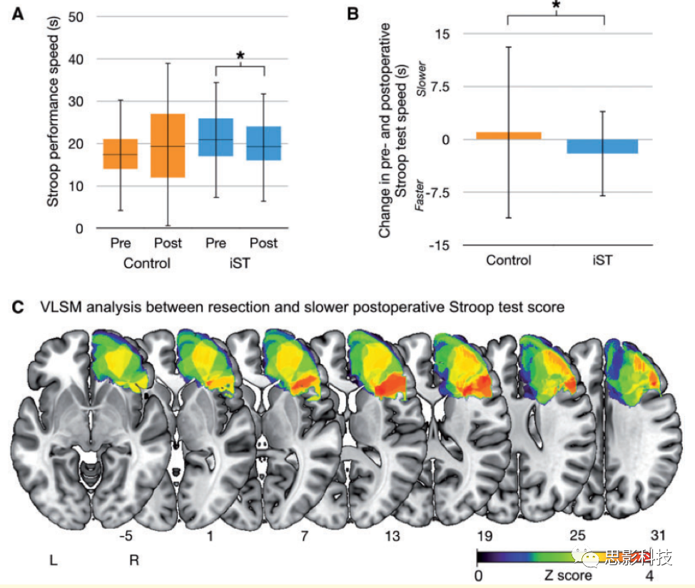 iST與非iST患者,術(shù)前術(shù)后評分是否有差異(雙因素混合設(shè)計方差分析):Stroop測試結(jié)果在兩組測量前后具有交互效應(分組-時間)(p=0.03)。事后分析表明,iST可改善Stroop測試結(jié)果(p = 0.003, adjusted P-value = 0.006 ),但非iST組術(shù)后Stroop測試也沒有出現(xiàn)明顯下降(p>0.05)。