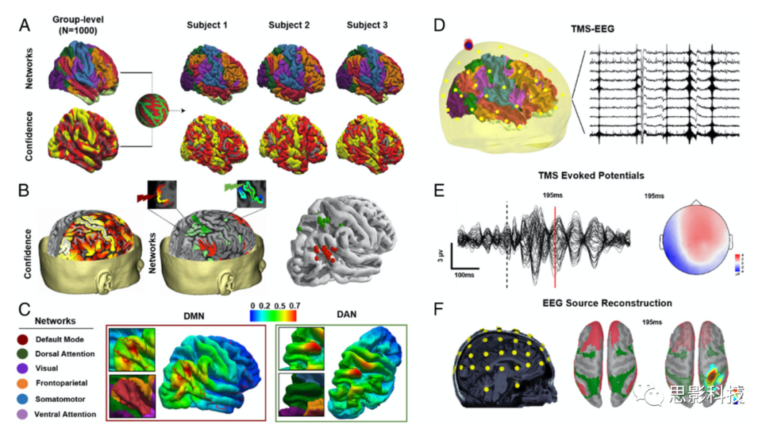 血氧水平依賴(BOLD)信號間接提供了神經元放電的信息,未能在較快的時間尺度上捕捉到正常生理功能的進程。本文使用fMRI引導的經顱磁刺激(TMS)和同步腦電圖(EEG)來表征高時間分辨率的腦網絡動態(tài)變化。用TMS誘發(fā)對默認網絡(DMN)和背側注意網絡(DAN)的可控的擾動(這里用的是perturbation這個單詞,可理解為通過神經刺激方式對刺激靶點腦區(qū)及相關網絡的功能干擾)。源定位水平上EEG傳播模式是特定于網絡的,并且在間隔1個月的掃描中具有高度重復性。此外,高階認知能力的個體差異與DAN和DMN間TMS傳播模式的特異性顯著相關,但與靜息態(tài)EEG無關。說明了TMS-EEG基于擾動的生物標記物,在高時間分辨率下表征個體大腦網絡動力學的潛力,并潛在地提供了對其行為意義的進一步洞察??梢宰鳛橐环N新興的聯合方法對個體大腦網絡動力學進行探測。
