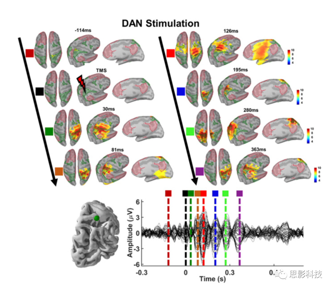 約180ms時,刺激DAN使DMN右側顳下和右額的激活程度降低。