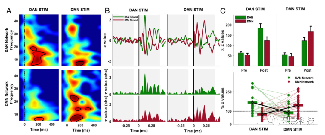 首先從DMN(圖1C中紅色陰影區(qū)域)和DAN(圖1C中綠色陰影區(qū)域)提取平均電流密度時間序列,并將其投影到每個個體的表面空間上。為了檢查不同刺激條件下TMS誘導的振蕩特性,首先計算了每個網絡的事件相關譜擾動(ERSPs)。使用開放源碼的EEGLAB函數(newtimef),使用 Morlet小波(周期0.5-3),500ms的時間窗,每次迭代滑動20ms。對ERSPs進行基線標準化(-500ms至0ms),并使用bootstrap確定刺激后的顯著激活。