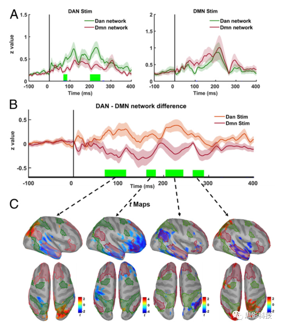100ms左右的時間窗中,與刺激DMN所誘發(fā)的活動相比,DAN右側頂葉的激活程度更高,而DMN右側顳下的激活程度則顯著降低。
