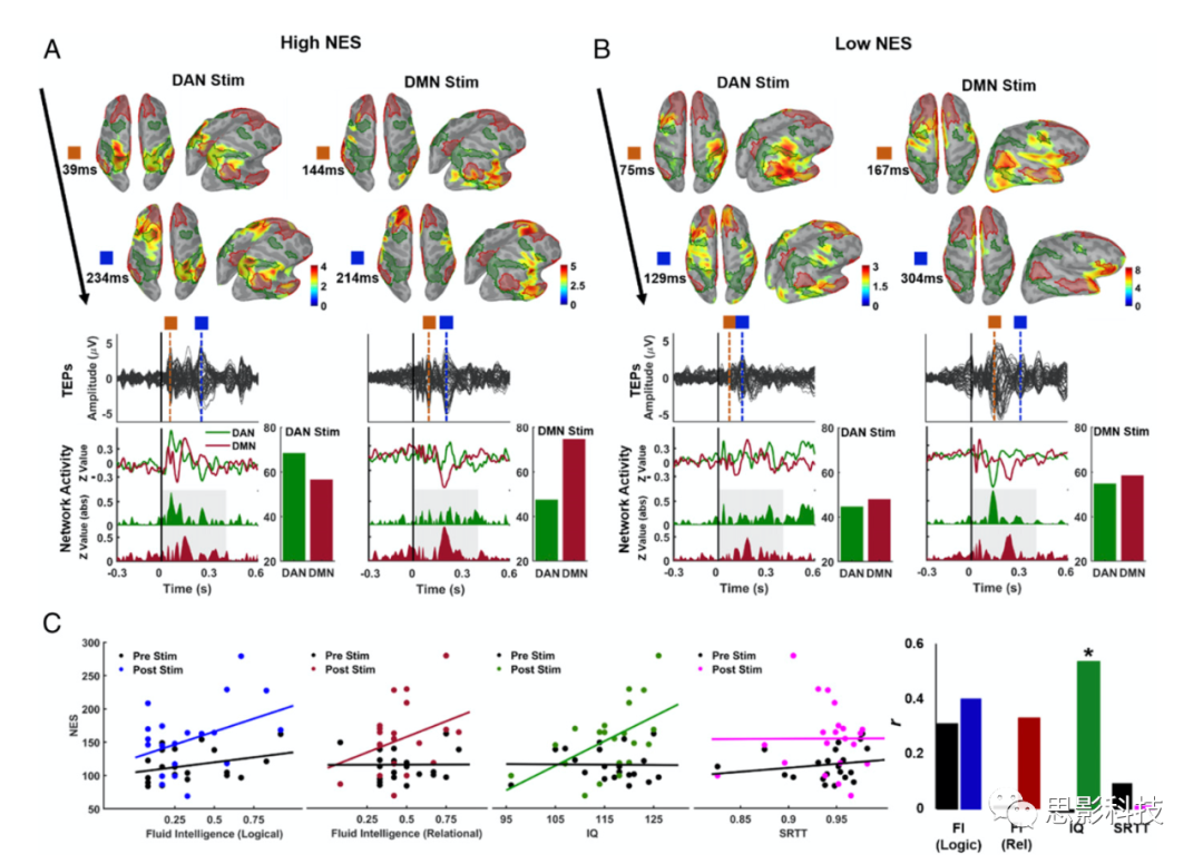 假設之一是,TMS后網絡分離(DMN/DAN)的大小與認知的個體差異有關。使用網絡特異性指標(網絡參與特異性[NES]) 量化TMS誘發(fā)的活動在目標網絡內的傳播情況。考慮到之前關于認知特征與RSNs動態(tài)、網絡效率和網絡間相互作用的研究,我們的目標是研究TMS網絡水平響應的特異性(刺激網絡的高激活與非刺激網絡的參與減少)是否與認知的個體差異性有關。較高的NES值反映了更特定的TMS誘發(fā)的皮層動態(tài)活動,可能捕捉到與分離/整合相關的大腦拓撲屬性。