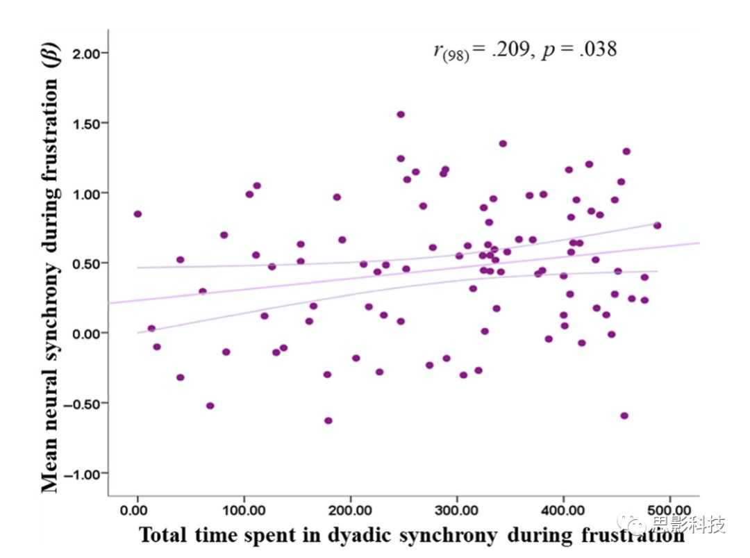 在挫折條件中,行為和神經(jīng)的同步性顯著相關(r(98) = .209, p = .038)(圖2)。在挫折條件下,整體同步性與行為同步性呈正相關。在恢復條件下,行為和神經(jīng)同步?jīng)]有顯著相關(r(98) = .094, p = .358)。
