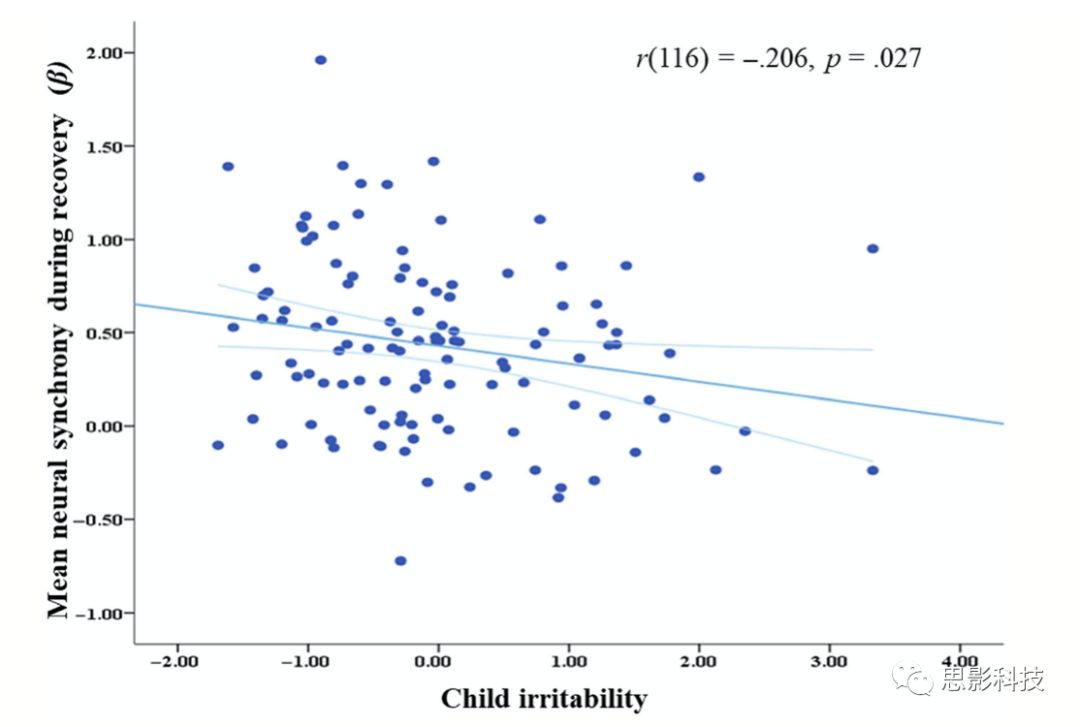 最后,評估在恢復期間,為探究應激性和神經(jīng)同步之間的相關是否是偽結果(即,這一結果是否由于從挫折到恢復的神經(jīng)同步下降導致),我們從神經(jīng)測量中創(chuàng)建了一個不同的分數(shù),并將其與兒童應激性做相關,其相關性不顯著(r(116) = .069, p = .463),表明兒童應激性與從挫折到恢復的同步性顯著降低無關。