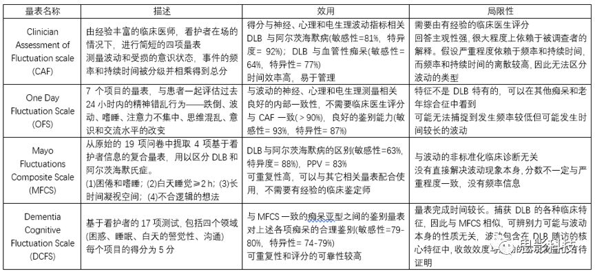 此外,MFCS和DCFS是為鑒別特征的差異性設(shè)計的,它強調(diào)喚起障礙的相關(guān)性,認為這是路易體癡呆波動的一個確定的、生物學(xué)上可能相關(guān)的特征。最后,所有問卷的共同之處在于他們通過嚴(yán)重性、頻度或相關(guān)癥狀來強化DLB中顯著的波動性認知障礙的能力。