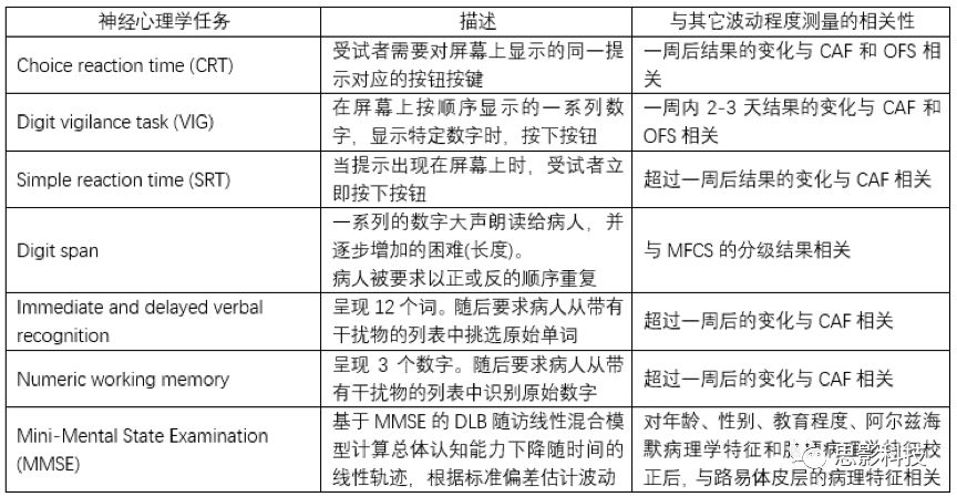 其次,使用神經(jīng)心理測試對較長時間尺度上的波動進行客觀測量。首先,涉及注意力任務(wù)的研究發(fā)現(xiàn),在90秒的測試范式中可以觀察到DLB患者反應(yīng)的顯著變化,也可以在間隔1小時甚至更長時間如1周的測試期間觀察到。這種表現(xiàn)的變化區(qū)別于DLB和其他癡呆,也與臨床波動量表相關(guān)。通過在48小時內(nèi)每隔幾小時對數(shù)字跨度進行重復(fù)測試,也可以得出顯著的波動。在更長時間尺度 (~7年), 臨床病理的一項社區(qū)調(diào)查研究發(fā)現(xiàn),被試認知下降情況與預(yù)測的下降軌跡(用來表示波動)之間的偏差和路易體相關(guān)。