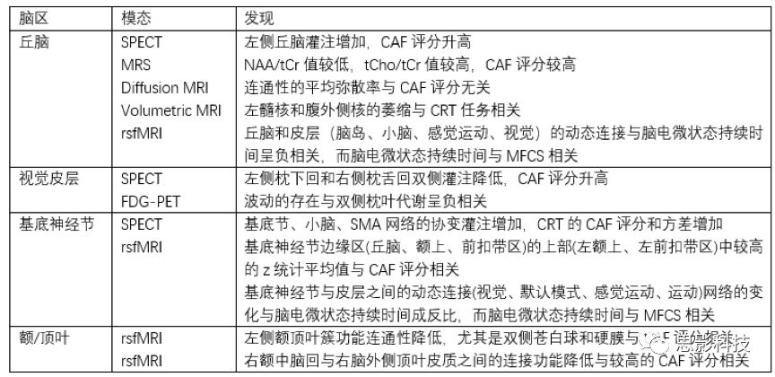 鑒于波動性認知障礙的動態(tài)性,靜態(tài)模式,如結(jié)構(gòu)核磁共振成像可能不適合研究認知波動。使用99mTc-HMPAO單光子發(fā)射計算機斷層掃描(SPECT)的灌注研究是第一批顯示患者波動差異的影像學(xué)研究之一。在早期的研究中, CAF評分增加與左側(cè)丘腦灌注增加、兩側(cè)枕下灌注減少顯著相關(guān)。利用擴散成像和磁共振波譜(MRS)的結(jié)合來識別丘腦中投射到前額皮質(zhì)和枕葉皮質(zhì)的亞區(qū)在結(jié)構(gòu)和神經(jīng)化學(xué)方面的差異,發(fā)現(xiàn)了具有波動性認知障礙患者的丘腦-皮層連通性的變化。