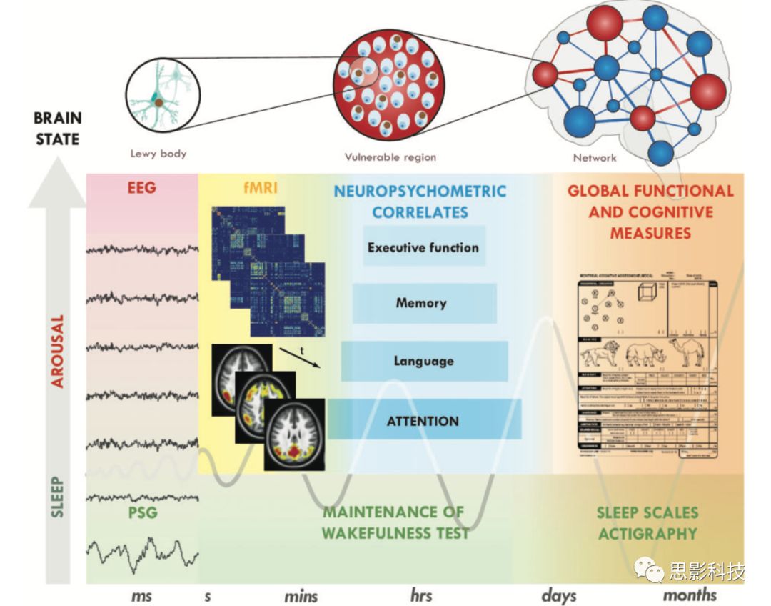 作者認為波動是由大腦狀態(tài)的無序切換引起的,這種狀態(tài)有助于睡眠的連續(xù)。大腦狀態(tài)的轉(zhuǎn)變是由局部和整體皮層活動模式的特定變化來定義的(即“皮層狀態(tài)”),它伴隨著相應(yīng)的行為變化。關(guān)于這一點,最好的例子就是覺醒和睡眠之間的過渡,其腦電特征是從低振幅、去同步的快頻率節(jié)奏到更同步的低頻非快速眼動(NREM)睡眠階段。同樣,在清醒狀態(tài)下,正常人的神經(jīng)元活動和行為表現(xiàn)也會出現(xiàn)波動,越來越多的人認識到,皮層活動的自發(fā)變化意味著在一系列認知任務(wù)中表現(xiàn)的變化,尤其是針對精神運動警覺和選擇性注意的任務(wù)。路易體癡呆的波動性認知障礙可能也是一樣,皮質(zhì)狀態(tài)的波動從毫秒/秒(如從睡眠到醒來的轉(zhuǎn)變)到小時/天的各種時間尺度上(如隨著睡眠壓力或代謝影響的增加,響應(yīng)能力發(fā)生變化)。