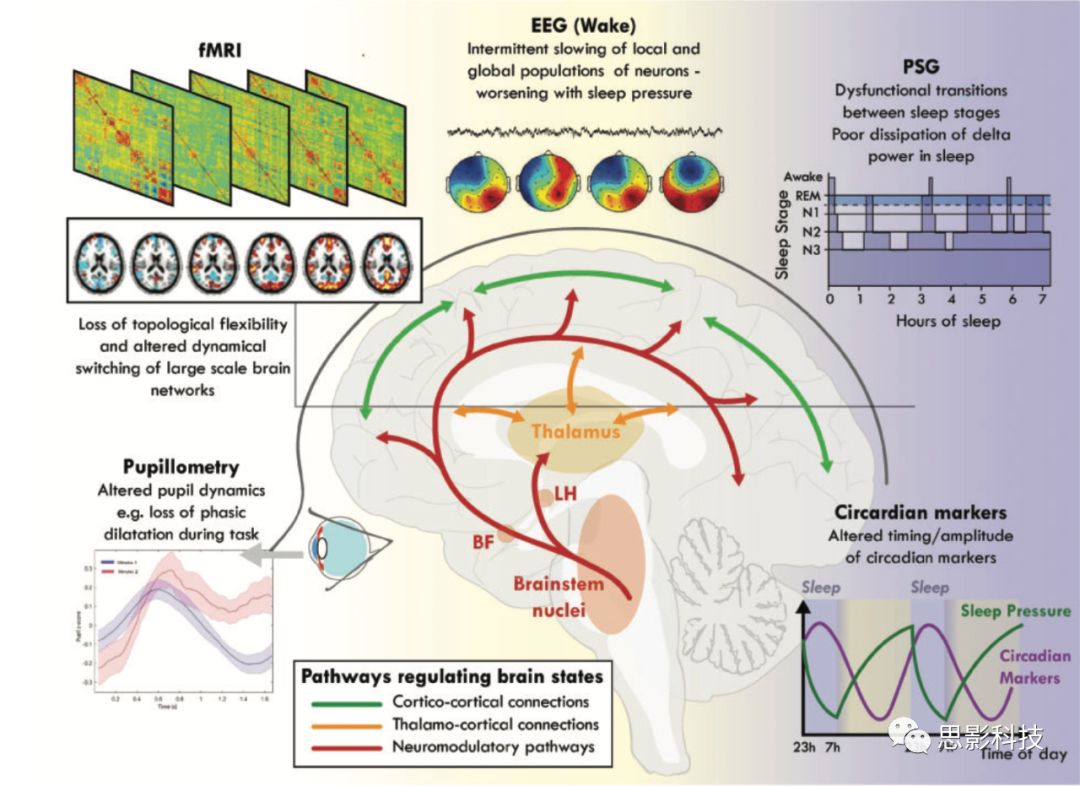多個大腦區(qū)域和神經(jīng)遞質(zhì)/神經(jīng)調(diào)節(jié)通路在皮質(zhì)狀態(tài)的轉(zhuǎn)變和維持中起著重要的作用。具體來說,研究強調(diào)了來自腦干和基底前腦的單胺能(如去甲腎上腺素能)和膽堿能細胞群、下丘腦外側(cè)的orexin能神經(jīng)元、丘腦皮層回路和皮層神經(jīng)元本身在調(diào)節(jié)皮層狀態(tài)中的上行投射的重要性。由這一框架產(chǎn)生了一些候選的病理靶點,將解釋波動性認知障礙的出現(xiàn),并提供與臨床檢測相關(guān)的預(yù)測(圖2)。