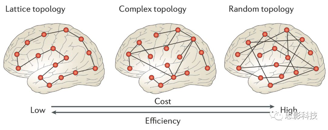 中間圖-復(fù)雜拓?fù)?/span>:人類的腦網(wǎng)絡(luò)位于規(guī)則拓?fù)渑c隨機(jī)拓?fù)渲g,在空間上相鄰的節(jié)點(diǎn)之間構(gòu)成短距離的模塊,模塊間具有長(zhǎng)距離的連接,這種特征會(huì)最小化布線成本。因此,腦網(wǎng)絡(luò)在最小化物理布線成本和最大化整合效率之間進(jìn)行了經(jīng)濟(jì)上的權(quán)衡。