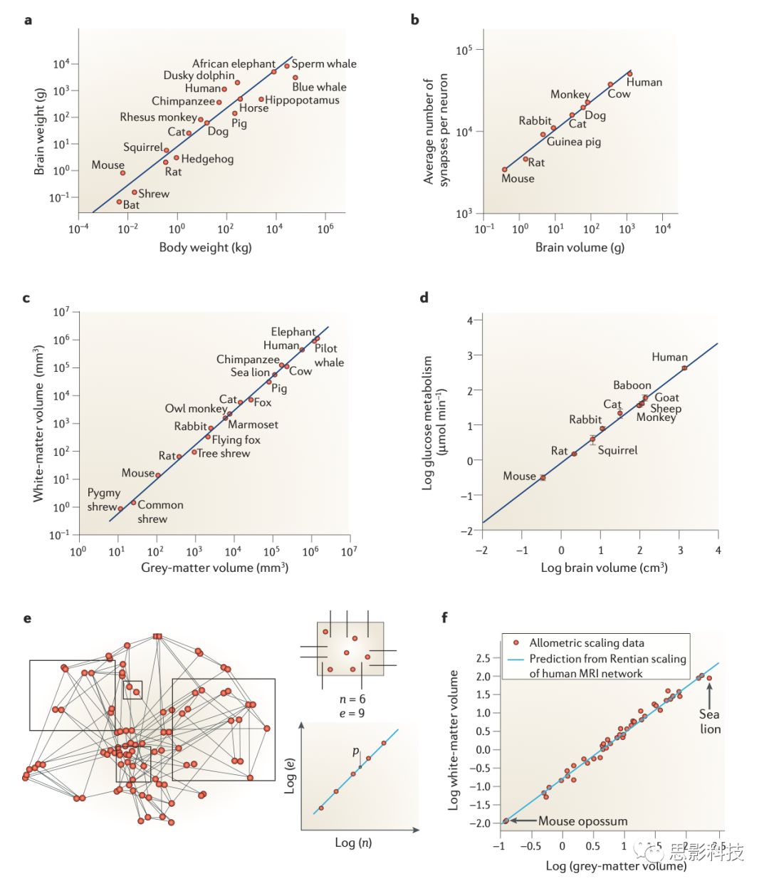 e 單一物種的腦網(wǎng)絡(luò)內(nèi),腦區(qū)之間的連接數(shù)量呈分形比例變化:結(jié)點(diǎn)越多(n值較高)的灰質(zhì)區(qū)域連接越多(e值較高),符合冪律分布,稱為分形或Rentian縮放,縮放指數(shù)為p;