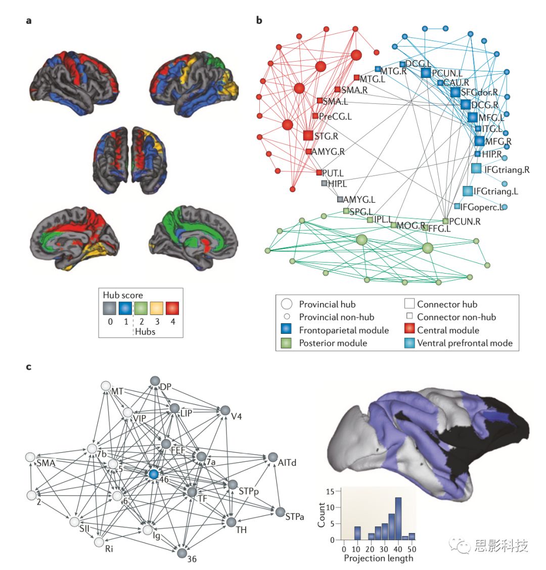 c hub通常是多模態(tài)關(guān)聯(lián)皮質(zhì),例如,獼猴背外側(cè)前額葉皮層中的Brodmann區(qū)域46(藍(lán)色圓圈;深藍(lán)色區(qū)域)與遠(yuǎn)程腦區(qū)有大量的長(zhǎng)距離連接。