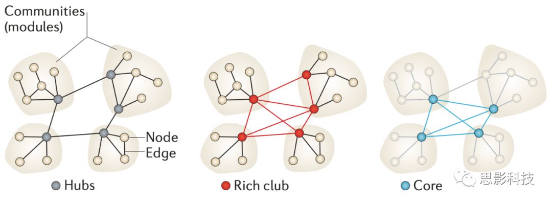 網(wǎng)絡(luò)社團(tuán)(community)由密集互連的節(jié)點(diǎn)組成,表現(xiàn)為模塊化的腦網(wǎng)絡(luò)。模塊化是可進(jìn)化性的重要組成部分,即生物系統(tǒng)產(chǎn)生可遺傳表型變異的能力。模塊內(nèi)連接往往比模塊間連接短,這樣的空間排列節(jié)省布線和通信的成本,并提高專用神經(jīng)計(jì)算的局部效率。模塊化網(wǎng)絡(luò)可以更有效地應(yīng)對(duì)可變環(huán)境帶來的不斷增長(zhǎng)的處理需求,也可抵御動(dòng)態(tài)擾動(dòng)和結(jié)構(gòu)連接性的微小變化。雖然模塊內(nèi)邊可節(jié)省布線成本,但是模塊之間的功能整合需要增加成本或遠(yuǎn)距離的軸突,以互連空間較遠(yuǎn)的腦區(qū),即產(chǎn)生連接hub。對(duì)貓、猴和人腦中樞紐區(qū)域的分析顯示出密集互連的“富人俱樂部”,在全局有效的信息流方面發(fā)揮著核心作用。上圖所示的富人俱樂部由五個(gè)節(jié)點(diǎn)組成,這些節(jié)點(diǎn)的度為4或更高,而核心分解產(chǎn)生一個(gè)核心網(wǎng)絡(luò),包括四個(gè)節(jié)點(diǎn),最小度為3。