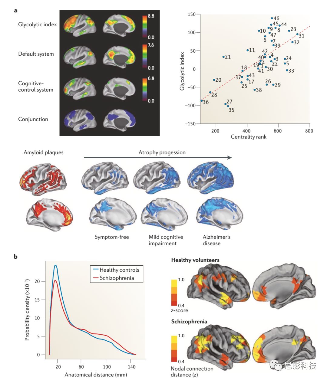 a腦網(wǎng)絡(luò)和大腦代謝。左上方圖:有氧糖酵解的區(qū)域分布、默認(rèn)網(wǎng)絡(luò)、認(rèn)知控制系統(tǒng)以及這兩個(gè)系統(tǒng)與糖酵解指數(shù)的聯(lián)合;右上方圖:中心等級(jí)與41個(gè)Brodmann區(qū)域的糖酵解指數(shù)的相關(guān)性非常顯著,r = 0.66(P <0.00005),即中心度越高的區(qū)域糖酵解指數(shù)越高。下圖:高成本的核心節(jié)點(diǎn)通常受阿爾茨海默癥淀粉樣蛋白沉積和灰質(zhì)萎縮的影響,從而導(dǎo)致記憶障礙依賴于大規(guī)模網(wǎng)絡(luò)完整性的功能