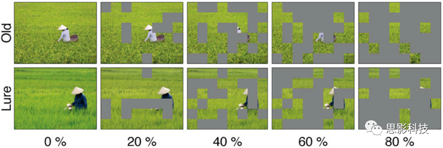 刺激包括240幅圖像或120組(A-B)獨特但相似的800×600像素圖像,呈現(xiàn)于黑色背景下。在測試階段,操作變量為圖像的持續(xù)時間(250ms,500ms,750ms)和退化水平(0%,20%,40%,60%,80%)。通過在圖像上隨機(jī)放置100×100像素的灰色正方形來降低圖像質(zhì)量(如圖1),以評估模式完成。模式完成的操作定義為,從部分或退化的輸入信息中檢索完整的記憶表征。將圖像隨機(jī)分配到四個研究/測試區(qū)組中的一個,在持續(xù)時間、退化水平和探針類型(舊的、新的)之間進(jìn)行平衡。每個研究區(qū)組呈現(xiàn)的30幅圖像中,被試重復(fù)看其中的15張圖像,將其視為測試目標(biāo)(“舊的”),從另一組相似圖像中提取的誘餌作為剩余15張目標(biāo)圖像。