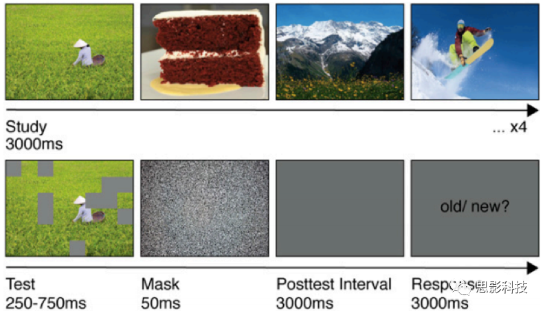 在研究期間,每張圖像呈現(xiàn)3000毫秒。在試驗之間出現(xiàn)2000毫秒的注視十字(此處未顯示),以便進(jìn)行在線漂移校正。每張研究圖像呈現(xiàn)四次。在測試期間,每個測試探針呈現(xiàn)250、500或750 ms,要么完全呈現(xiàn)(0%退化),要么20%、40%、60%或80%的圖像被100×100像素的灰色正方形遮擋。在測試探針之后,呈現(xiàn)一個視覺掩蔽50毫秒,之后呈現(xiàn)一個灰色方塊3000毫秒,在此期間,要求被試將呈現(xiàn)的圖像可視化。最后,給受試者3000毫秒的時間,以表示呈現(xiàn)的圖像是“舊的”(在研究中呈現(xiàn))還是“新的”(即,誘餌:與研究中呈現(xiàn)的圖像相似,但不完全相同)。請注意,所有圖像和灰色測試后間隔方塊在黑色背景上以800×600像素顯示;圖像在此展開以進(jìn)行可視化。