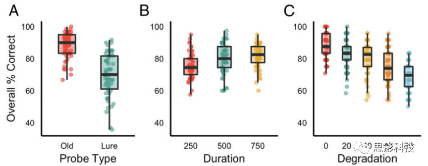 通過模型比較得出的準(zhǔn)確度最佳擬合模型的結(jié)果顯示了探針類型、持續(xù)時間和失真化的顯著影響(表1)。相對于誘餌圖像(圖5A),舊圖像的記憶正確率更高,并且隨著測試探針持續(xù)時間的增加(圖5B)和測試探針退化程度的降低(圖5C)而增加。