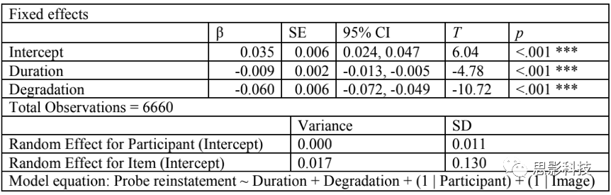 通過模型比較得出的探針恢復(fù)的最佳擬合模型(即測試探針圖像的恢復(fù))(表2)的結(jié)果顯示了持續(xù)時間(圖6A)和退化(圖6B)的顯著影響,表明測試探針的恢復(fù)隨著測試探針持續(xù)時間的增加和退化而減少。表2 探針恢復(fù)