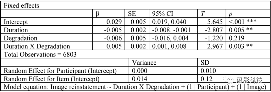 通過模型比較得出的最佳圖像恢復(fù)模型(即一般顯著圖像區(qū)域的恢復(fù))(表S3)的結(jié)果顯示了持續(xù)時間的顯著主效應(yīng),和持續(xù)時間×退化的顯著交互效應(yīng)(圖6C),結(jié)果表明,隨著測試探針持續(xù)時間的增加,恢復(fù)降低,而且隨著測試探針退化的增加,該效應(yīng)衰減。