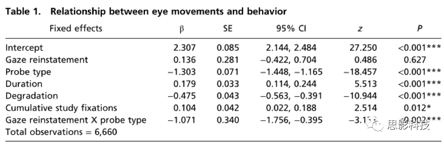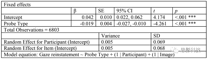 被試的隨機(jī)效應(yīng)方差和標(biāo)準(zhǔn)差(截距)分別為0.148和0.384。對于項目(截距),這些值分別為0.427和0.653。模型方程:正確率~注視恢復(fù)+探針類型+持續(xù)時間+退化+累積研究注視+凝視恢復(fù)×探針類型+(1 |被試)+(1 |項目)。*P<0.05,***P<0.001。