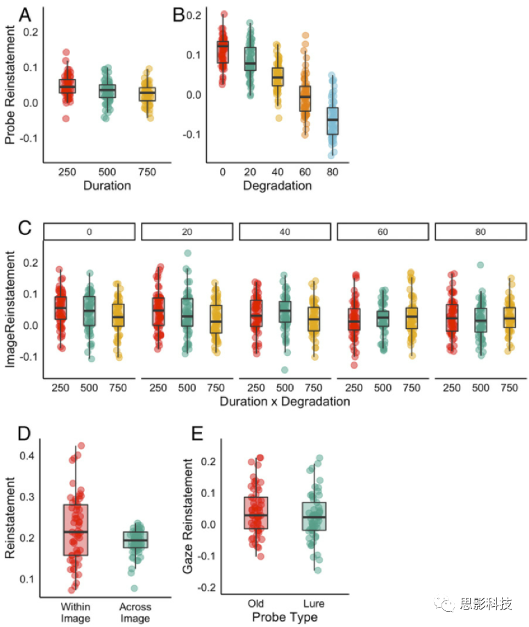圖6 (A) 隨持續(xù)時間和(B)退化的探針恢復(fù)。(C) 隨持續(xù)時間和退化的圖像恢復(fù)。(D)圖像內(nèi)和跨圖像(排列50次)的恢復(fù)分?jǐn)?shù)。凝視恢復(fù)是通過圖像內(nèi)(原始)分?jǐn)?shù)減去圖像間(排列)分?jǐn)?shù)來計算的。(E) 隨探針類型的凝視恢復(fù)。