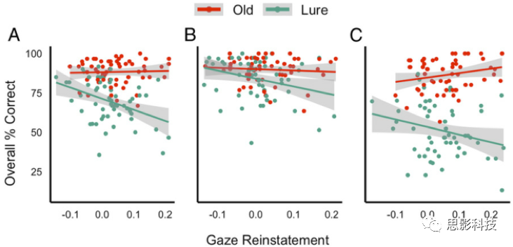 對于舊圖像,通過分別在研究期間和試驗后間隔內(nèi)(即A-A)比較同一圖像的編碼和檢索相對應(yīng)的凝視模式來進(jìn)行分析。重要的是,對于測試時呈現(xiàn)的誘餌圖像,測試后間隔的凝視模式與研究期間類似(誘餌)圖像的編碼對應(yīng)的凝視模式(即A-B)相比較。因此,一張舊圖像的高凝視恢復(fù)分?jǐn)?shù)表示相同圖像的恢復(fù),而一張誘餌圖像的高分?jǐn)?shù)表示相似研究圖像的恢復(fù)。