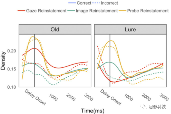 圖8:隨著時間的推移舊圖像和誘餌圖像凝視恢復(fù),圖像恢復(fù),探針恢復(fù)?;謴?fù)時間由各點(50 ms)相應(yīng)密度圖中的值進(jìn)行索引。實線表示正確的反應(yīng),虛線表示不正確的反應(yīng)。