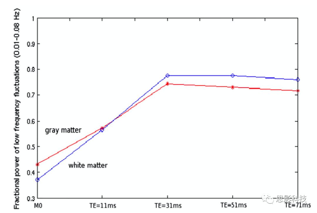 從圖2可以看出,WM中低頻帶的分數(shù)隨回波時間的變化而變化,并且與GM具有相當?shù)目杀刃?,這表明它們具有相似的生理起源和(潛在)意義。特別是在最近幾年,有幾份文章表明,在任務態(tài)下出現(xiàn)某些WM腦區(qū)的激活。