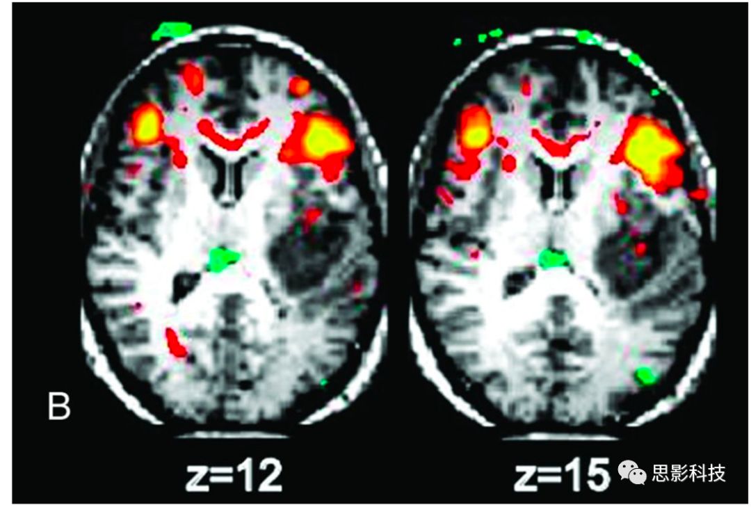 Fig 3. 靜息態(tài)MRI中,基于左側Broca區(qū)域作為種子點識別出與語言相關腦區(qū)。