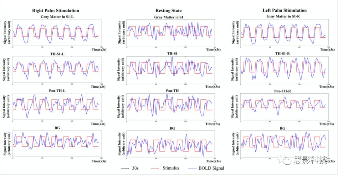 Fig 7 在灰質的S1腦區(qū)中,與連接丘腦和S1相連的WM纖維束的 BOLD信號的時間變化(12個HC)。紅色:任務態(tài)刺激block設計示意圖。藍色:BOLD響應。