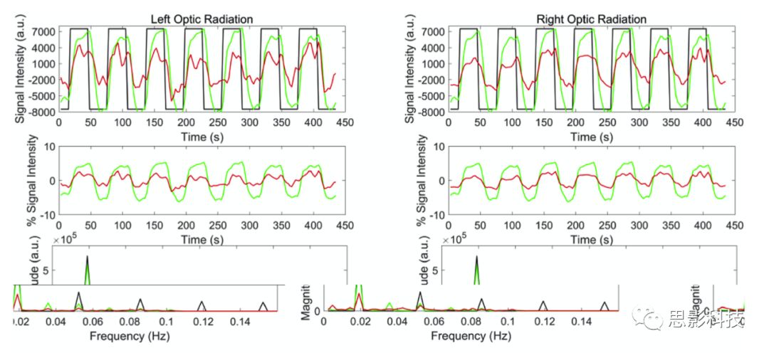圖8 時間序列的BOLD信號(頂部和中間行)及其傅里葉變化(底部行)呈現(xiàn)一個簡單的交替視覺刺激。