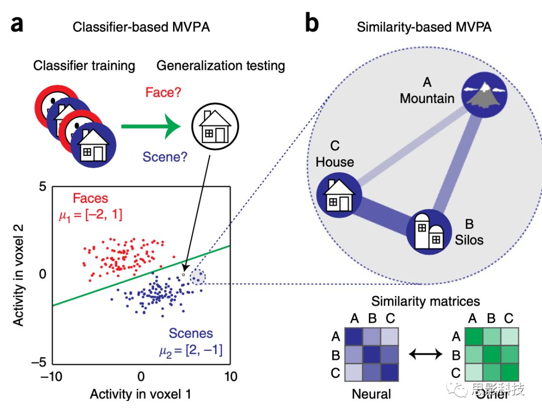 (a) 基于分類器的MVPA學(xué)習(xí)一個(gè)邊界,該邊界可區(qū)分與不同認(rèn)知狀態(tài)(例如,面部表情與場景表情)相關(guān)的fMRI模式。