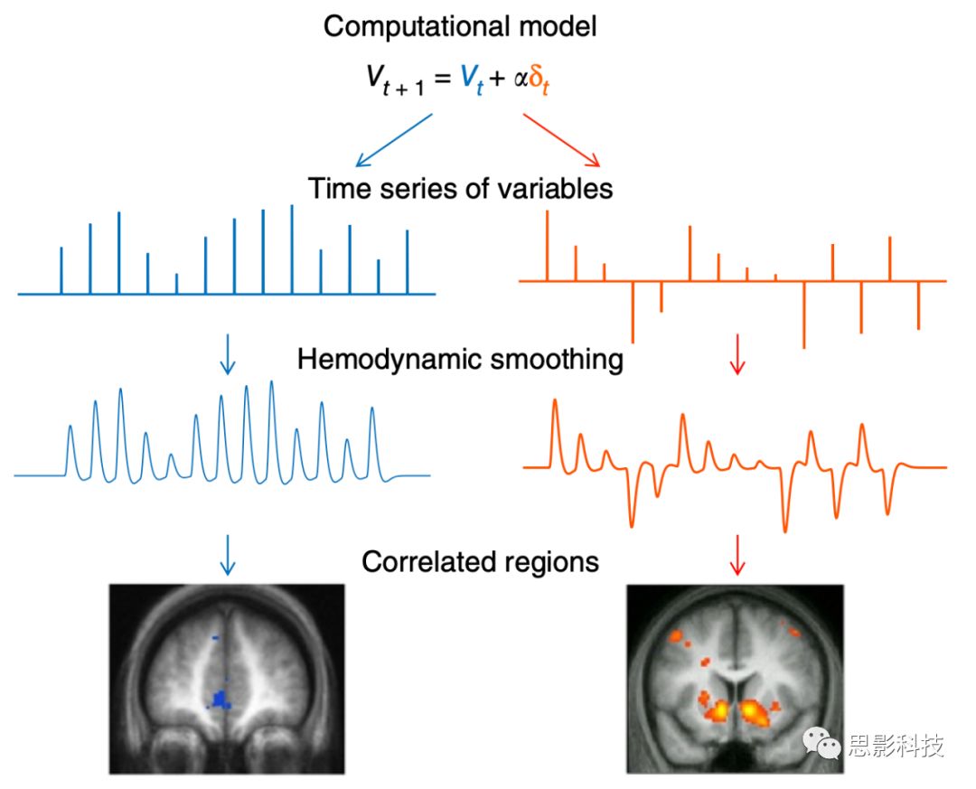 Figure 3 基于模型的功能磁共振成像的示意圖。計(jì)算模型(頂部;錯(cuò)誤驅(qū)動(dòng)的獎(jiǎng)勵(lì)學(xué)習(xí)模型)可用于生成內(nèi)部變量的候選時(shí)間序列(藍(lán)色的值V和紅色的預(yù)測(cè)誤差δ)。在通過平滑處理解決血液動(dòng)力學(xué)滯后(中間)之后,這些變量可用作回歸器,以尋找大腦中(底部)相關(guān)的BOLD活動(dòng),從而產(chǎn)生可被視為用于執(zhí)行或跟蹤模型中相應(yīng)計(jì)算過程的候選區(qū)域。α,學(xué)習(xí)率參數(shù)。