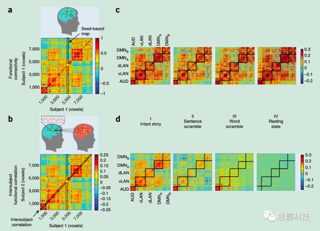 (c)基于體素的功能連接協(xié)方差矩陣揭示了不同實(shí)驗(yàn)條件下的相似網(wǎng)絡(luò)組織。這四個(gè)實(shí)驗(yàn)條件是:(i)完整的故事,(ii)句子打亂,(iii)單詞打亂和(iv)靜息態(tài)。