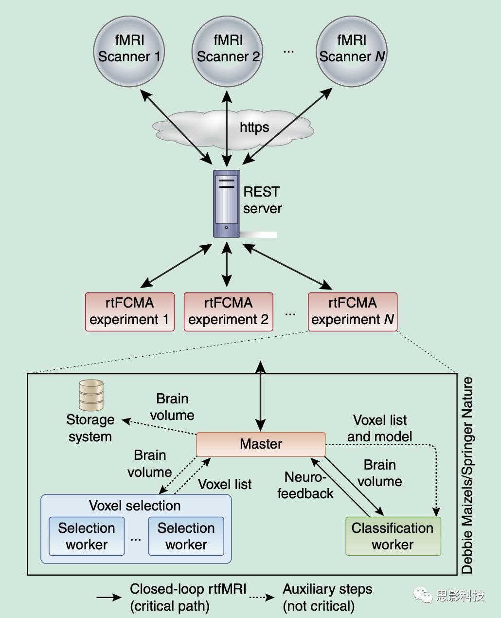 fMRI掃描儀通過互聯(lián)網(wǎng)將采集到的腦影像數(shù)據(jù)發(fā)送到中央系統(tǒng)上,然后由系統(tǒng)返回神經(jīng)反饋。每個(gè)掃描儀都使用服務(wù)器集群來獲取自己的數(shù)據(jù)分析結(jié)果(此處為FCMA),實(shí)時(shí)提供神經(jīng)反饋,并通過重復(fù)的特征選擇和分類器訓(xùn)練來持續(xù)地更新分類器。