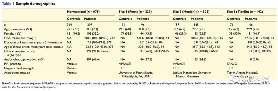這項研究收集了來自三個地點(diǎn)的PHENOM子樣本。研究人員有意從各種成像協(xié)議中選擇了樣本,包括來自德國的1.5 T數(shù)據(jù)。為確保疾病亞型不受位點(diǎn)/方案的偏倚,他們通過利用“留一(數(shù)據(jù)中心)交叉驗證”(這個方法是指每一次留出一個數(shù)據(jù)站點(diǎn)的所有數(shù)據(jù)用于測試,剩下的站點(diǎn)數(shù)據(jù)用于訓(xùn)練,重復(fù)多次,直到所有數(shù)據(jù)都參與了測試),進(jìn)一步驗證了亞型分類的可重復(fù)性。圖像由各自的研究人員共享,并在賓夕法尼亞大學(xué)的生物醫(yī)學(xué)圖像計算和分析中心進(jìn)行了分析。從941名精神分裂癥患者和對照組的國際隊列中選取被試,只分析45歲以下的被試,以減少衰老造成的影響。表1列出了最終選出來的樣本(307位精神分裂癥患者和364位健康對照者)的人口統(tǒng)計學(xué)數(shù)據(jù),反映了聯(lián)合隊列研究和MRI掃描協(xié)議的多樣性。來自三個站點(diǎn)的數(shù)據(jù)詳情如下: