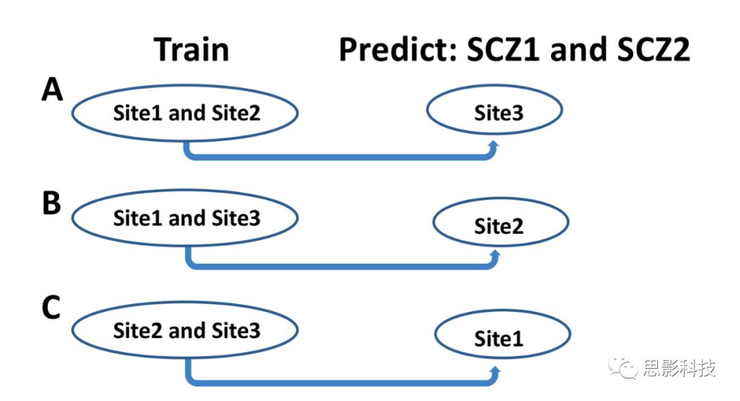 圖1 LOSO預(yù)測示意圖:每個站點(diǎn)的兩個亞型(SCZ1和SCZ2)是使用在其他兩個站點(diǎn)上訓(xùn)練的HYDRA模型確定的。同一亞型的患者重疊率為86.72% (站點(diǎn)1為83.33%,站點(diǎn)2為86.21%,站點(diǎn)3為90.63%),與使用所有站點(diǎn)的數(shù)據(jù)訓(xùn)練得到的結(jié)果相比較。