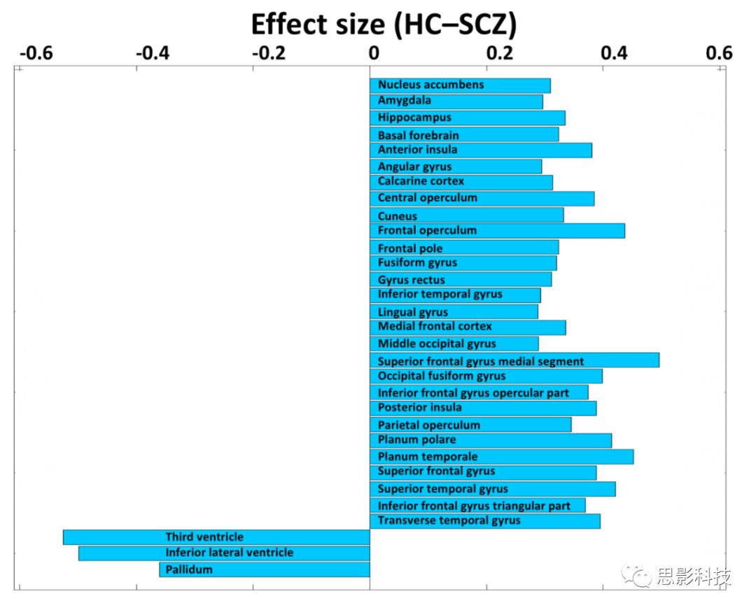 圖2 健康對照組(HC) (n = 364)和精神分裂癥(SCZ) (n = 307)的關(guān)鍵區(qū)域的體積差異。注意,在這個標(biāo)準(zhǔn)病例對照比較中,區(qū)域體積既呈現(xiàn)減少的趨勢又呈現(xiàn)增加的趨勢。